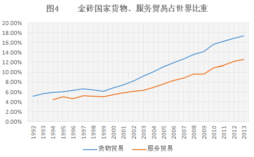 若从整体上看,金砖国家对外贸易总额占据世界的比重从1994年的5.6%上升至2013年的16.45%,上升幅度高达3倍多。而若把货物贸易与服务贸易分开来看,则金砖国家在货物贸易中则扮演了更为重要的角色。据统计,从1994年到2013年,金砖国家的贸易总额占世界贸易总额的比重从5.59%上升至16.93%,幅度约为3倍(见图3)。其中货物贸易占比由5.91%增长至17.38%,服务贸易占比由4.40%增长至12.59%。由图4可知,货物贸易在这二十多年间一路领先于服务贸易,且两者的差异有变大的趋势,说明金砖国家目前仍旧从事以货物为主的贸易方式,服务贸易在未来仍旧有较大的发展空间。