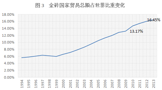 复旦大学金砖国家研究中心和复旦大学经济学院近日发布的“金砖国家贸易报告(2014)”显示,金砖国家对外进出口总额自1994年开始除个别年份外,呈现一路上升的趋势,由1994年的5920.77亿美元飙升至2013年的75529.99亿美元,涨幅高达12.76倍。
