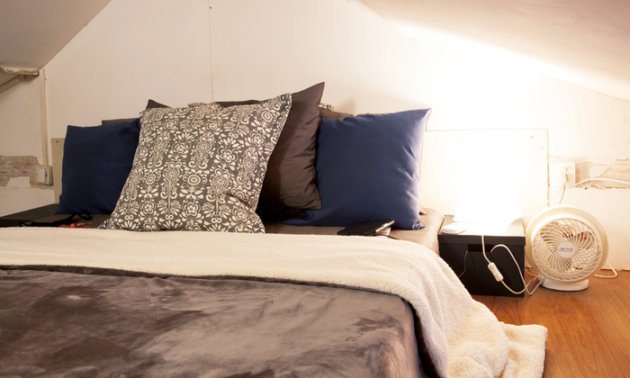 傅伟桓的房东之前搭了个阁楼作为卧室,所以房子整体层高略低,采光不好。傅伟桓想了个办法,把墙全部刷白,再装了个三头射灯,一下子就亮堂了许多。