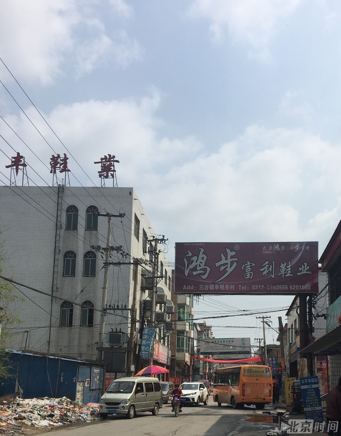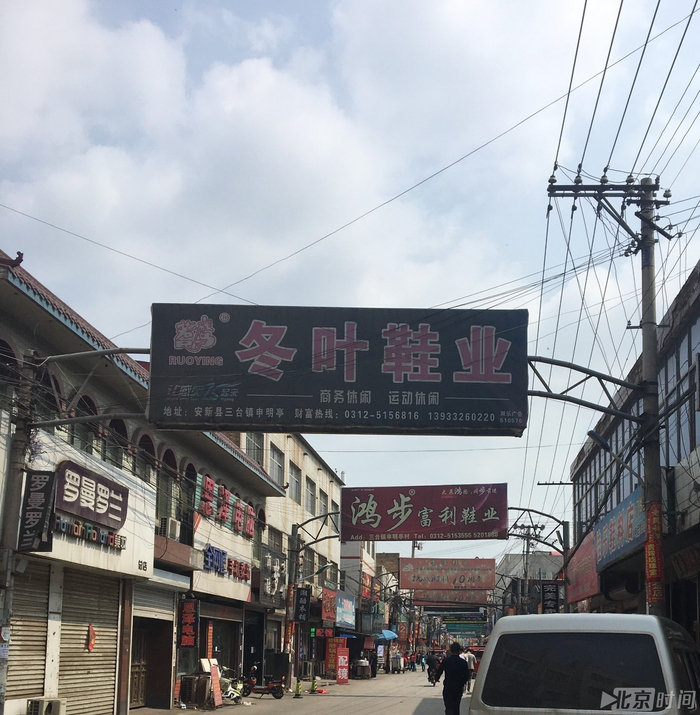 北京时间“财镜”从安新县乘坐2路公交车,沿着356县道前往享有“北方鞋都”美誉的三台镇。北京时间“财镜”注意到,从刚出安新县道三台镇,总共二十多公里路程,在狭窄的道路两边,小作坊鞋厂鳞次栉比、让人眼花缭乱。