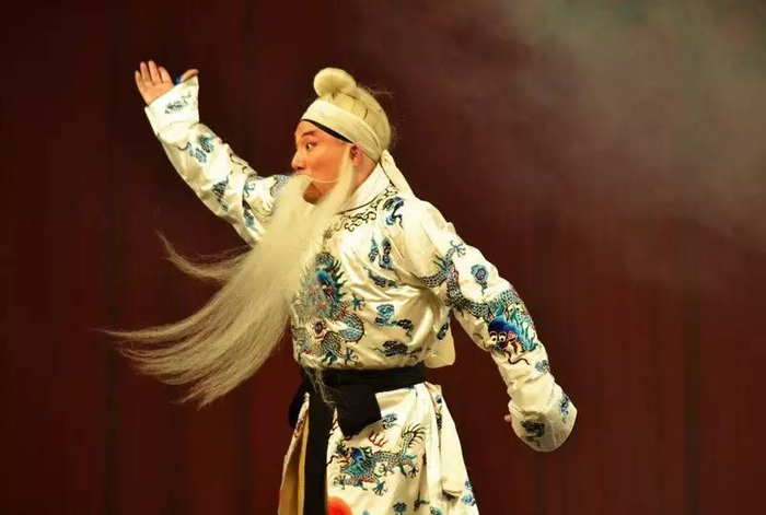 耍髯口是戏曲表演中生、净、末、丑极富特色的肢体及面部动作,以呈示人物当下的特定情绪。古人言“在颐曰须,在颊曰髯”,髯口又称口面、髭口,是生、净、末、丑必戴的假须——大都用马尾、牦牛毛、犀牛毛或人发制成,一般有黑、灰、白三种。后来戏曲丰富了,髯口也多起来,比如戴红髯、紫髯、蓝髯、黑红髯,借以凸显其形貌怪异或性格暴烈,至于戴红、黄、蓝、白、黑五色髯的,意在表示强烈的贬斥倾向,如粤剧中扮金兀术和方腊的,便是五色髯。