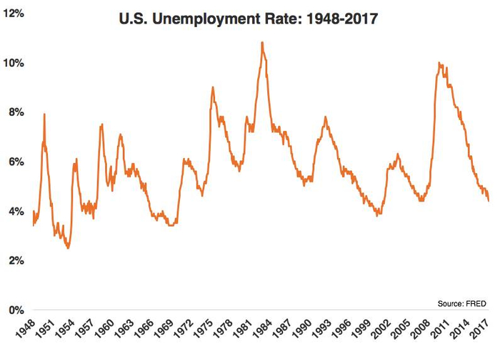 从1948年至今,美国失业率处于4.5%以下的时间略超五分之一。在上世纪50年代、60年代末和70年代初期,失业率都曾在相当长的时间里保持在4.5%以下,但之后直到1998年末才再次跌破4.5%。失业率分别在2006年和2007年短期跌至4.4%,之后在金融危机期间再度大幅飙升。