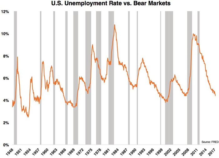 鉴于经济形势已经好转了相当长的一段时间,许多投资者对未来回报的预期已经让位给围绕下一轮熊市将于何时到来的担心。在梳理历史上美股熊市与失业率之间的联系时,我们开始看到不同关系的出现。下图显示了同一时间框架内的美国失业率,其中灰色阴影区域表示标准普尔500指数处于熊市区域:
