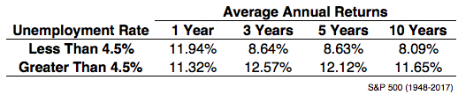 作为股市走势的前瞻性指标,当前失业率水平预示的结果有喜有忧。以下是1948年至2017年期间失业率高于和低于4.5%时标准普尔500指数的平均年回报率: