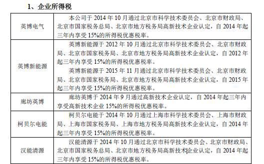 此外,英博电气营业外收入占公司利润总额的比重分别为21.17%、29.63%、21.16%,而营业外收入主要由政府补助和软件产品销售增值税退税构成,特别是英博电气、廊坊英博、柯贝尔电能和汉能清源同时在2014年10月获得15%的所得税优惠税率,有效时间3年,英博电气是否能再次享受政策的优惠不得而知。