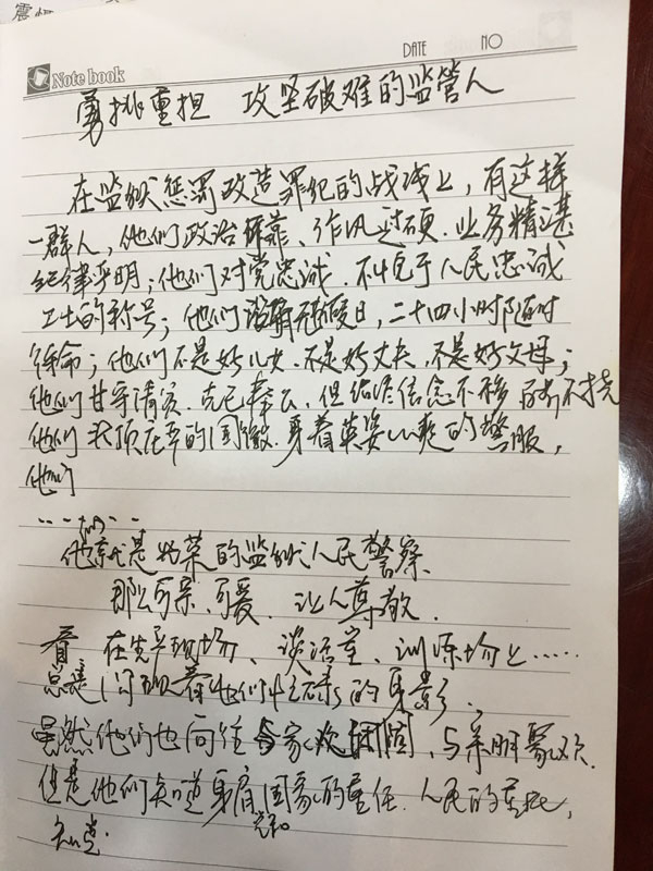 新华网北京7月14日电(吴丁一)“在监狱惩罚改造罪犯的战线上,有这样一群人,他们政治可靠,作风过硬,业务精湛,纪律严明;他们对党忠诚,无愧于人民忠诚卫士的称号;他们没有节假日,二十四小时随时待命;按常理他们不算是好儿女,不算是好丈夫,不算是好父母;他们甘守清贫、克己奉公,但始终信念不移,百折不饶;他们头顶庄严的国徽,身着英姿飒爽的警服……他们就是光荣的监狱人民警察……虽然他们也向往阖家团圆,与亲朋欢聚,但是他们知道他们肩负党和国家的重任,人民的重托……”这是监狱民警汤洪林在笔记本里的一段话。在社会关注的聚光灯之外,一直有那么一群人在默默奉献着,不为大众所了解。作为他们之中出色的一员,四川省巴中监狱六监区党支部书记、监区长汤洪林用他的一生为这段话写下了动人的注脚。