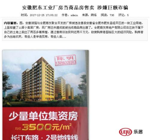 购房户迟迟拿不到房屋,他们发现他们用保命钱买的房屋是合肥商友房地产有限公司和安徽浪强环保科技集团公司合作开发的工业厂房,根本就不能销售,很明显他们被骗了!购房户纷纷向有关部门反映,甚至报警。