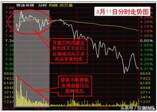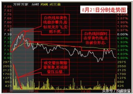 上图:早盘白色分时线和黄色均价线稳步攀升,看似“双龙出海“,实则不然,成交量同期却呈现缩量现象,走出前量压后量的走势,而且在白色分时线回调过程中直接击穿黄色均价线,走出破位形态。
