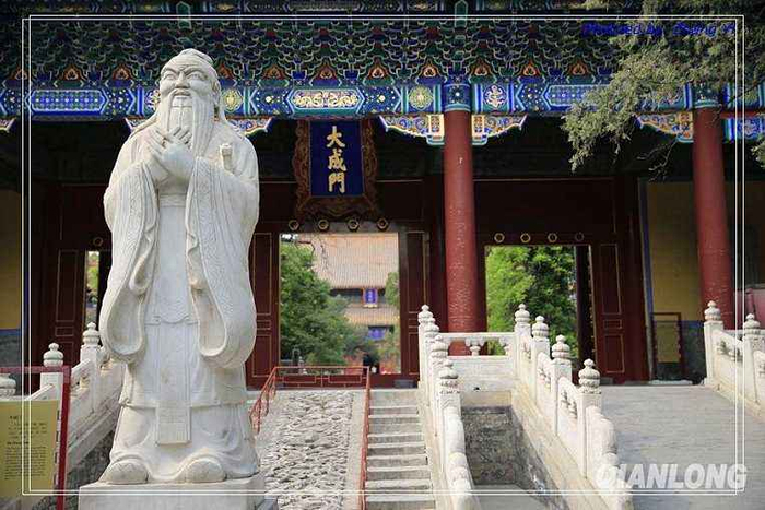 文庙既孔庙。孔庙占地22000平方米,有三进院落。中轴线上得建筑依次为先师门、大成门、大成殿、崇圣祠。前院东面有碑亭、神厨、省牲亭、井亭;西面有碑亭、致斋所,并有持敬门与国子监相通。两侧排列着198座元、明、清三代进士题名碑,刻有51624名进士的姓名、籍贯、名次,是研究我国科举制度的珍贵实物资料。大成门外有乾隆石鼓和与之有关的两座清代石碑。中院的主要建筑为东西庑和13座御碑亭;后院崇圣祠独立成院,集合成北京孔庙完整的古建筑群体。