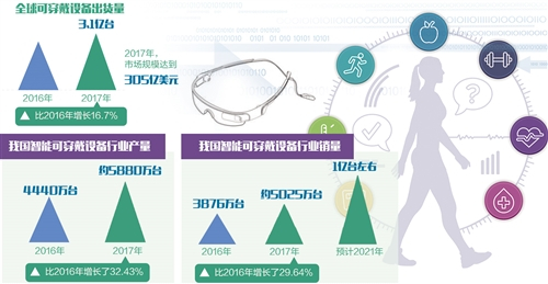 从全球市场看,2017年全球可穿戴设备出货量为3.1亿台,比2016年增长16.7%,市场规模达到305亿美元。智能可穿戴设备已在医疗保健、导航、社交网络、商务等领域推出了相对成熟的产品。从国内市场表现看,来自市场研究机构前瞻产业研究院的数据显示:去年我国智能可穿戴设备行业产量约5880万台,同比2016年的4440万台增长了32.43%;2017年我国智能可穿戴设备行业销量约5025万台,比2016年的3876万台增长了29.64%,预计2021年销售规模将会达到1亿台左右。