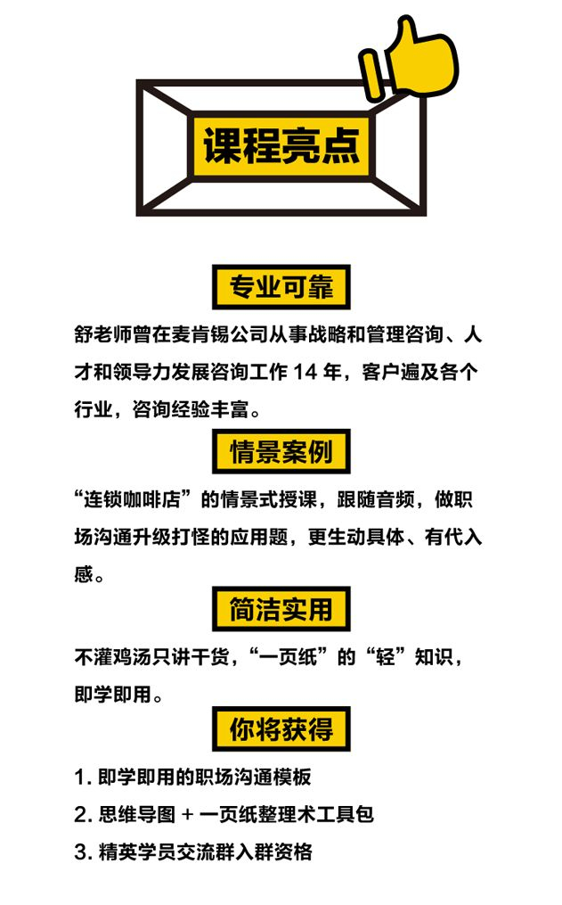 课程采用情景代入法,手把手地教你各个场景中,如何高效沟通、简明汇报。