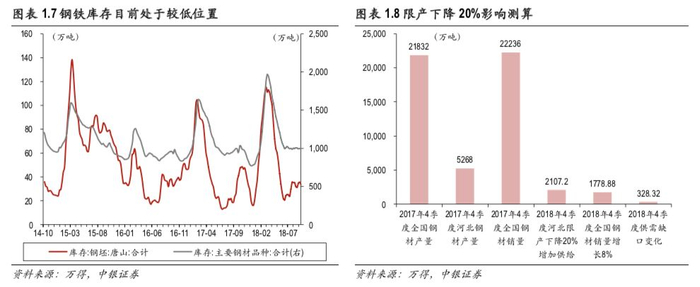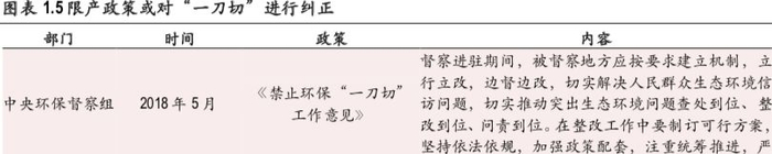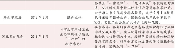 地方政府或对“一刀切”式的政策进行纠正,但环保的压力决定了限产或只会结构性的调整,而很难出现总量的大幅下降。地方政府会不会大幅度下调限产的比例呢?我们需要弄清楚,地方政府之前限产的核心动力到底来自哪里。不论是三大攻坚战中污染防治的总要求,还是各年环保部出具的阶段性考核指标,都对地方政府形成了强约束,通过“简单粗暴”的限产直接完成污染防治任务,成为了一种“理性”的选择。因此,虽然环保部在去年相关计划中明确过重点城市的限产比例,但地方对限产本身也是支持配合,甚至扩大进行的。这一点,从环保部与地方政府的政策内容中可以看出一些端倪。今年以来,环保部在督查期间,专门研究制定了《禁止环保“一刀切”工作意见》,明确反对“不分青红皂白”实施集中停业停工行为,而今年三季度严厉程度超出预期的限产中,唐山市政府的相关文件明确指出过因为城市空气质量排名较差,将提前进行错峰生产并且对钢铁行业限产50%(据华尔街见闻)。结论是,地方政府限产的根本动机并非来自环保部的直接限产要求,而是环保指标的考核压力,即使环保部赦免限产比例的要求,但地方政府制定具体政策时是否会降低限产比例,仍然取决于环保指标考核的压力大不大。从上面的分析中可以发现,今年虽然空气质量要求低于去年,但完成难度并不低,地方政府可能会对“一刀切”政策进行纠偏,对限产进行结构性调整,但大面积整体性的降低限产比例的可能性或不大。