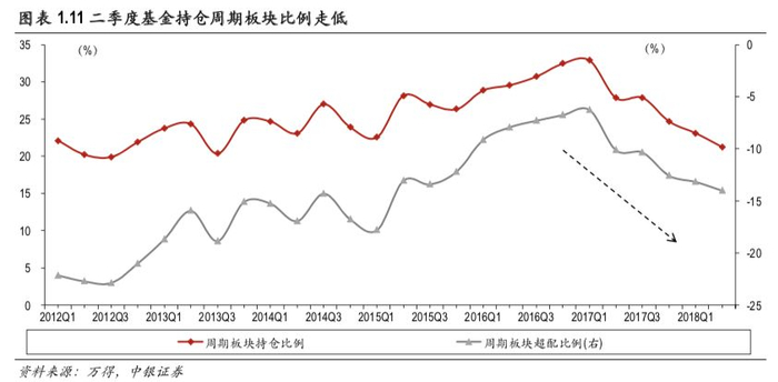 最后,机构近期对周期板块的持仓比例较低,短期向下的相对压力不大。从交易层面来看,由于经济下行压力较大,加之投资增速回落幅度超出预期,市场此前对于周期板块的预期较为悲观,导致持仓情况不理想。今年一季度与二季度的基金持仓数据显示,周期板块的持仓比例和超配比例均持续下降,目前显著低于历史平均水平。在近期对机构投资者的走访中,也反馈周期板块的加仓比例并不是特别高。