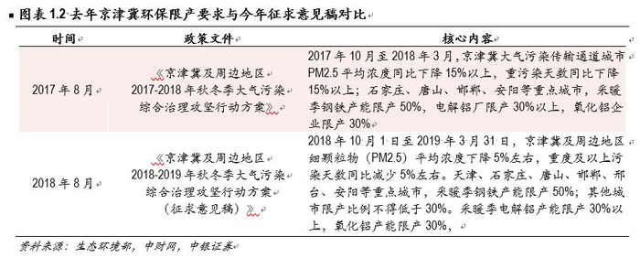 若政策发生变化,核心内容或在总量的污染考核指标上进行放松,而不是直接下调限产的比例。政策调整的消息传出后,市场普遍预期今年采暖季限产的比例会大幅度下降,实际情况是否如此?从生态环境部的政策制定角度出发,核心的要求是环境质量达到一定标准,目前集中体现在空气质量指标上,而限制生产只是实现目标的途径之一。因此,我们理解,如果政策真的发生放松,应该是在总量的污染指标上进行一定的放松,而不是直接要求限产比例下降,更不会指导加大生产。去年京津冀及周边地区冬季大气治理方案中要求空气污染指标下降15%,今年8月治理方案征求意见稿则是降低至5%。
