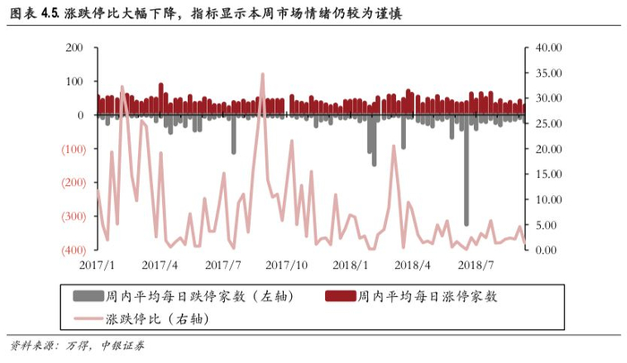 当周市场换手率小幅下降至1.14%,涨跌停比例大幅下降至1.40。本周市场成交情况整体走弱,市场单周累计成交额11,975.88亿元(前值12,904.31亿元),环比(-7.19%),规模小幅下降;全市场自由流通换手率下降至1.14%(前值1.19%),下降了0.06个百分点。打板情绪方面,全周市场涨跌停比大幅下降至1.40(前值4.67),下降了3.27,全周涨停家数接近跌停家数,该指标显示市场交易情绪仍较为谨慎。