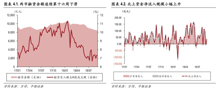 北上资金情绪有所回暖,全周资金净流入规模回升为正数。本周陆股通合计净流入38.55亿元(前值-8.55亿元),海外资金呈现流入趋势,北上资金净流入规模小幅上升,环比+551.03%,沪股通和深股通规模均回升为正数。具体地,沪股通净流入20.26亿元(前值-8.54亿元),环比增量28.80亿元,深股通净流入18.29亿元(前值-0.0049亿元),环比增量18.30亿元。