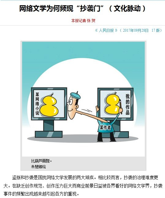 比较悲催的是,由《如懿传》再度引发的网络文学“抄袭风”再被点名批评。《人民日报》去年9月底发文说:“网络文学频现抄袭门。文化资本的逐利性、商业力量的诱惑力、读者市场的激烈竞争都是抄袭的直接推手,但背后还是人的价值观在起支配作用。”
