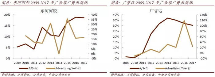 我们挑选了8个行业16个品牌广告主作为代表样本,研究他们在2009-2017年广告推广费用趋势。我们发现,这些公司广告占收入比例基本稳定;但是大多数公司由于业务有一定周期性,与营业收入相关的广告费用增速也呈现周期性,在2012-2013年经济低迷周期广告费用增速明显下降;但是优质的头部品牌广告主在经济低迷周期,广告预算也基本保持正增长,较少数会出现0-20%的下滑幅度但恢复增长较快。