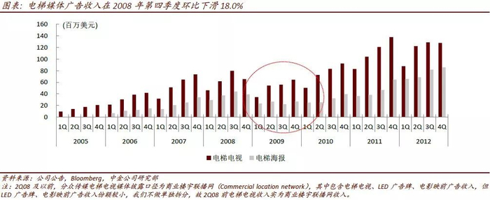我们研究了2008年和2012年分众传媒的表现。首先,宏观环境对分众传媒广告收入的冲击是客观存在的,营收增速会出现下滑;其次,应收账款周转天数大幅提升或是较为显著的先行指标。但与此同时,我们发现,虽然分众传媒在经济下行周期经历了短暂的低迷,但是中长期业绩企稳回升,2008年电梯媒体业务经历了6个季度下滑后转正,2012年电梯海报业务保持持续增长,电梯电视业务增速放缓4个季度,2013年起增速逐渐企稳。