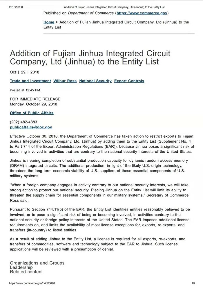 美国时间10月29日,美国商务部发布公告称“将福建晋华集成电路有限公司加入实体清单”,对福建晋华采取限制出口措施。美国商务部称,“福建晋华即将完成DRAM的量产,该技术可能源自美国,且将威胁到为美国军方提供此类芯片的供应商的生存。”