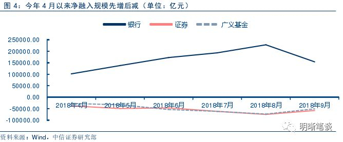 今年资金净融入规模的扩大得益于从4月开始的宽松货币政策环境和监管的边际放松。随着中美贸易摩擦的增大和国内去杠杆等措施导致的经济增速缓慢问题发酵,央行进行3轮降准措施,再加上资管新规从4月份出台后又在7月出台了细则,从监管层角度来看在强监管方向出现了边际宽松,有助于稳定市场预期,消除资本市场不确定性,恢复市场信心。今年4月以来以银行为主的存款类金融机构净融资规模出现回升资金利率呈现回落。银行质押式逆回购净额从10.2万亿元一直持续上升到8月的22.8万亿元,而证券和广义基金的回购金额分别从4月的3.78万亿元和2.72万亿元增长到8月份的7.50万亿元和7.35万亿元。