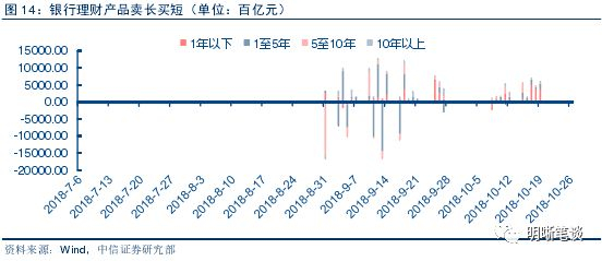 今年7月以来,银行从9月开始大幅减持债券,进入10月份后,仍然在减持,只是减持量有所下降。从久期结构看,3年内到期的中短期债券及7-10年到期的长期债减持比例较大。债券品种方面,政金债、同业存单和国债是主要减持对象。