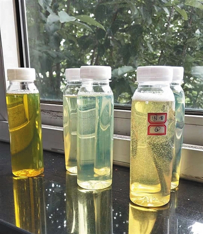 在他的办公室里,张经理拿来两瓶300毫升的油样展示。其中一瓶清澈透明,看上去和正常的汽油没有什么区别;另外一种颜色淡黄,相对混浊。