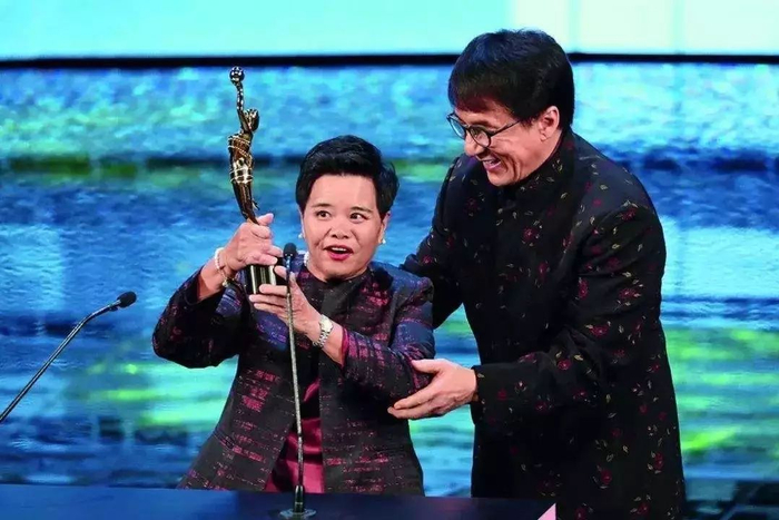 得知杨容莲获得今年的“专业精神奖”后,成龙专程飞回香港为她颁奖,还向大会道谢: