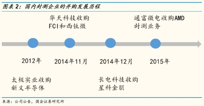 国内半导体行业通过外延式并购完成原始积累。2014年以后,我国半导体产业开始加速发展,通过海外并购的方式,在封装测试领域凭借资本投入优势和劳动力的比较优势形成了全球范围内具有竞争力的5大封测企业,在芯片设计领域,紫光集团携手国家产业基金进行多次产业并购,形成了在存储芯片和通讯芯片领域的核心竞争力,我们认为海外并购成为半导体产业发展初期最重要的推动力。