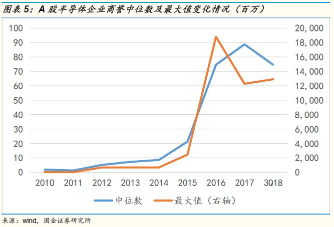 截止2018年3季度,A股半导体企业的商誉总和约为215亿,从图表4可以发现在2010年至2018年半导体行业经历两轮大的并购潮,第一次发生在2012年,商誉规模增同比激增了20倍,第二次行业大规模并购发生在2015-2016期间,整个行业的商誉在2015年和2016年先后大幅上涨了374%和576%。从绝对值来看,2016年半导体公司的商誉规模达到顶峰,2017年开始下降,降幅接近25%,也是商誉规模呈现首次下降,不过到了2018年三季度行业整体商誉规模重新回到上升阶段。