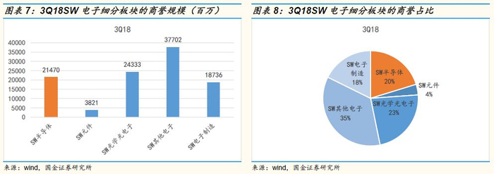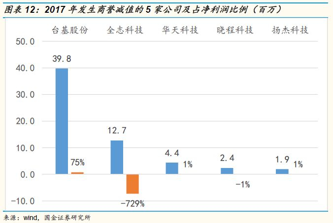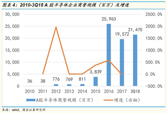 半导体属于整个电子板块的细分行业,国金证券策略组专题报告《商誉减值,一把“达摩克利斯之剑”》中,对于A股电子行业在3Q18的商誉规模测算达到869.64亿元,半导体板块的商誉占整个电子产业的商誉估值约为20%。以整个A股高达1.45万亿的商誉规模来看,半导体板块的商誉仅占不到1.5%,相对影响较小的板块。