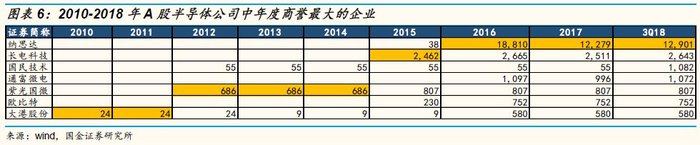 我们统计了从2010年至2018年8年间A股半导体行业中商誉最高的公司先后为:大港股份(2010-2011),紫光国微(2012-2014),长电科技(2015)和纳思达(2016-3Q18)。长电科技是国内的封测龙头,紫光系则担负起国内存储器拓荒的重任,长电科技和紫光集团借助并购一方面实现了自身的快速发展,另一方面也推动了国内半导体产业的快速成熟。2016年以后,纳思达先后进行了多次并购成为行业商誉最高的企业。