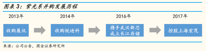 不仅在封装测试行业通过并购实现了行业的快速发展,作为国内芯片设计领域的龙头紫光集团同样借助并购的力量推动国内IC设计产业实现跨越式发展。紫光集团于2013年收购展讯通信,次年2014年收购锐迪科,并于2016年将两者整合为紫光展锐。凭借紫光展锐在移动通信基带芯片、射频芯片、物联网芯片、电视芯片、图像传感器芯片等领域的核心技术,紫光集团成为国内芯片设计的龙头企业。2016年,紫光国芯与武汉新芯公司合并,在武汉成立了长江存储,正式进入存储器芯片制造领域,肩负起国内存储芯片领域从零突破的重任。2017年3月紫光再下一城,从台湾南茂科技手中购得其子公司上海宏茂54.98%,成功布局存储封测领域,可以说并购的力量让紫光集团在半导体领域的版图迅速扩大,成为国内的“三星电子”。