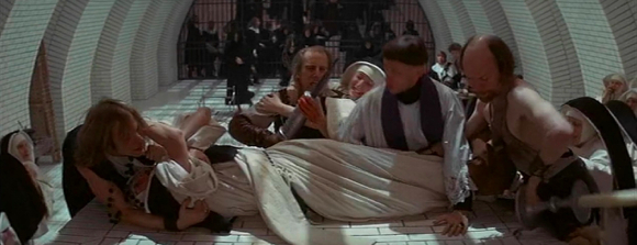 电影《卢丹的恶魔》剧照。据赫胥黎记载,驱魔人以“圣水”为名义,对女修士实行灌肠术。“这个职业最传统的象征物:一个巨大的黄铜注射器——像是莫里哀式闹剧中的道具,却是十七世纪医学的实际用具。强壮的手臂压住了她蠕动的身体,凭着行医多年的技巧,亚当先生向女院长实施了神奇的灌肠术”。