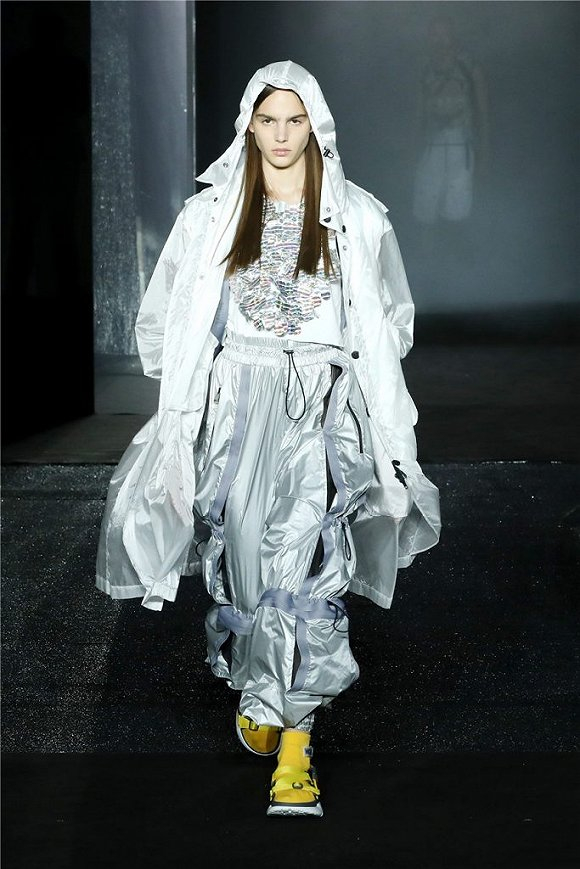 细节也同样值得注意。降落伞绳和潜水硬件使用,让T台上的模特们看起来就像随时要展开一场惊奇探险。那些闪着彩虹光芒的亮片让人想起鱼鳞在光照下的色泽。