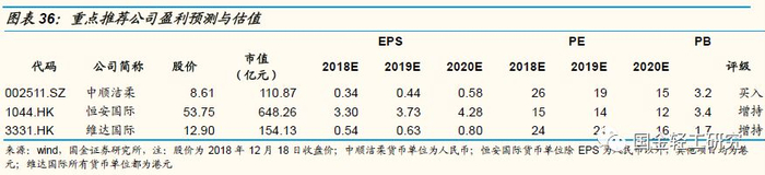 投资建议行业策略:近年来,全球木浆产能持续成长,而需求相对稳定,供需有所失衡,浆价大概率将承压下行,生活用纸行业有望迎来盈利能力改善。2017年,我国生活用纸消费量为851.1万吨,同比增长8.06%,增速为世界平均水平两倍多。另一方面,行业集中度已现向好信号,龙头企业对中小企业在资金、渠道和品牌等方面形成多重压力,排污水许可证等环保新政也将持续淘汰落后产能,行业正在步入高质量增长阶段。