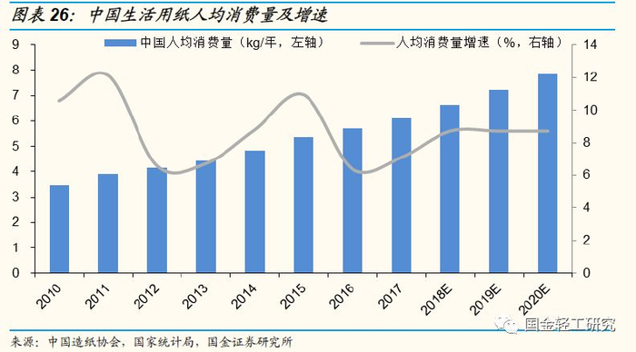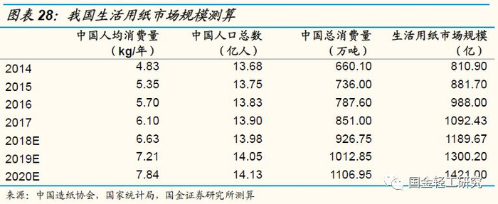 基于人均消费量测算,我们预测到2020年国内生活用纸市场规模将突破1,500亿元