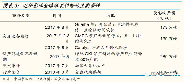 浆价自2016年11月起呈阶梯式上涨态势。从2016年11月初开始,木浆价格开始呈现阶梯上涨趋势,至2017年7月大幅拉升,截至年末已上涨62%价格处近十年内高位。我们认为,2016-2017年内国际木浆新增产能不达预期,以及突发设备检修事件的增加,导致阶段性木浆结构性供给收紧,成为浆价持续走强的主因。根据我们的统计,自2016年底以来,受检修、投产延期和森林大火等因素影响,国际木浆供给至少有600万吨产能受限。此外,作为木浆主要消费国,我国在期间内历经4次环保督察,中小造纸制浆企业的关停限产,也在一定程度上加深了供给不足。