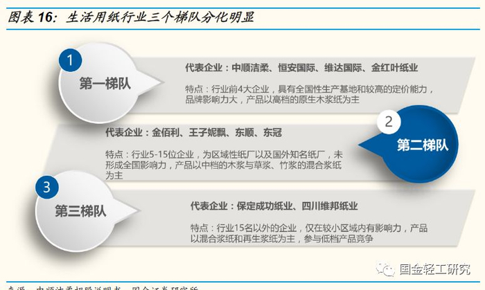 龙头企业已形成资金、设备、品牌和渠道等多重壁垒。1)资金:目前来看,中小纸厂产能主要集中于中低端生活用纸产品,此类产品因品质问题基本不具备提价空间,且几乎不存在新品研发,因此中小纸企整体盈利能力显著逊于大厂。其次,上市企业明显具备更多融资渠道,在资金端比中小企业拥有绝对优势。2)设备:在生活用纸领域,品质消费趋势日益明显,而新型纸机的使用成为保障纸品质量的重要手段,其中上浆成型效果较好的新型新月型纸机和BF纸机造价高昂,每台引进成本在3,000-6,000万元,是传统圆网或长网纸机的几十倍。由此来看,设备也将是制约中小企业长效增长的因素之一。3)品牌:根据国际日化用品龙头宝洁和联合利华的经验来看,日常生活类快消品适合采取多品牌战略。目前来看,恒安、维达和中顺洁柔等龙头企业均实现多品牌布局,完成对中高低端全层级消费者覆盖,且具备较高品牌认可度。相较之下,中小企业在品牌建设和推广上,明显缺乏充足资源投放和有效宣传,品牌基本难以构成竞争优势。4)渠道:中小型生活用纸企业多以区域性企业为主,渠道覆盖范围有限且短期内较难实现全国布局。而现阶段龙头企业却在加速渠道下沉,同时也不断优化升级终端销售渠道,预计品牌企业渠道触角延伸必将伴随中小企业空间被持续压缩。