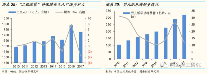 受益“全面二孩”,婴儿纸尿裤或加速扩张。2017年婴儿纸尿裤消费量322亿片,同比增加11.42%,整体市场规模约为550亿元,渗透率为59.60%,远低于欧美发达国家90%的水平。同时在人均用量方面,我国仅为3.2片/天,也低于欧美发达国家的5.6片/天。由此判断,婴儿纸尿裤市场未来具有较大的发展空间。2014年国家放开“单独二孩”政策,2016年“全面二孩”政策出台。从数据上看两项政策出台后,我国出生人口总数再次进入1,700万人/年,与2001年的水平相当。我们认为,二孩政策的放开可能并不会使得出生人口大幅增长,但总体基数必将缓慢扩大,未来伴随婴儿纸尿裤渗透率的提升,行业规模高速增长预期不减。