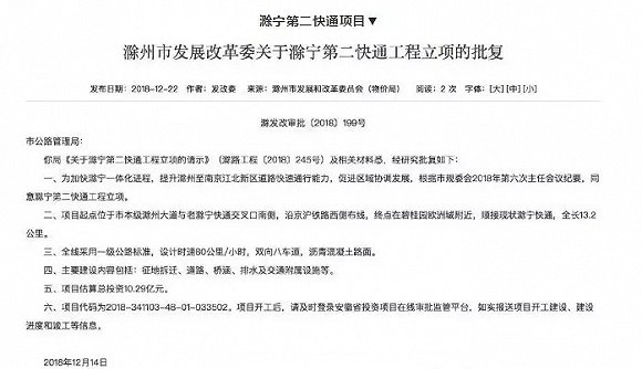 由该批复可知,项目起点位于市本级滁州大道与老滁宁快通交叉口南侧,沿京沪铁路西侧布线,终点在碧桂园欧洲城附近,顺接现状滁宁快通,全长13.2公里。