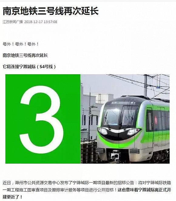 值得一提的是,上周有消息传出地铁三号线再次延长,将连接宁滁城际。目前地铁3号线三期工程环境影响已经正式公示,预计明年6月份开工。