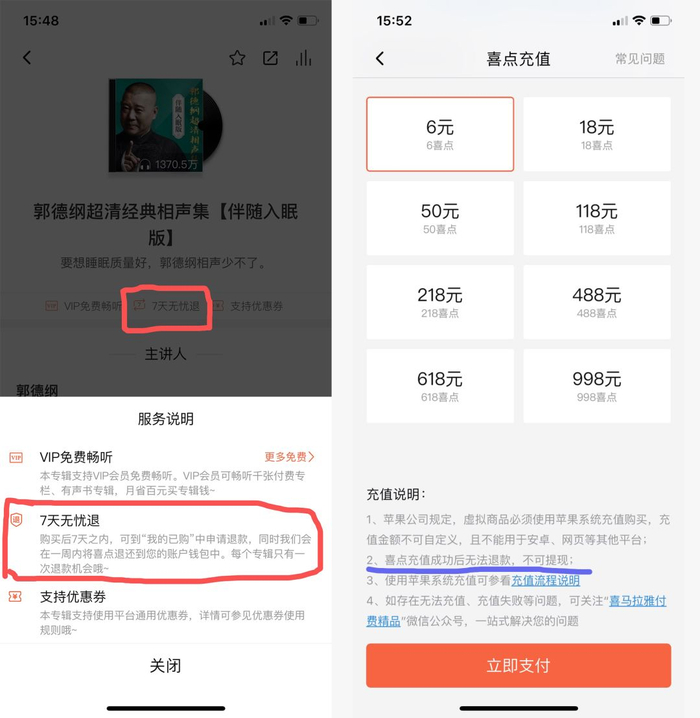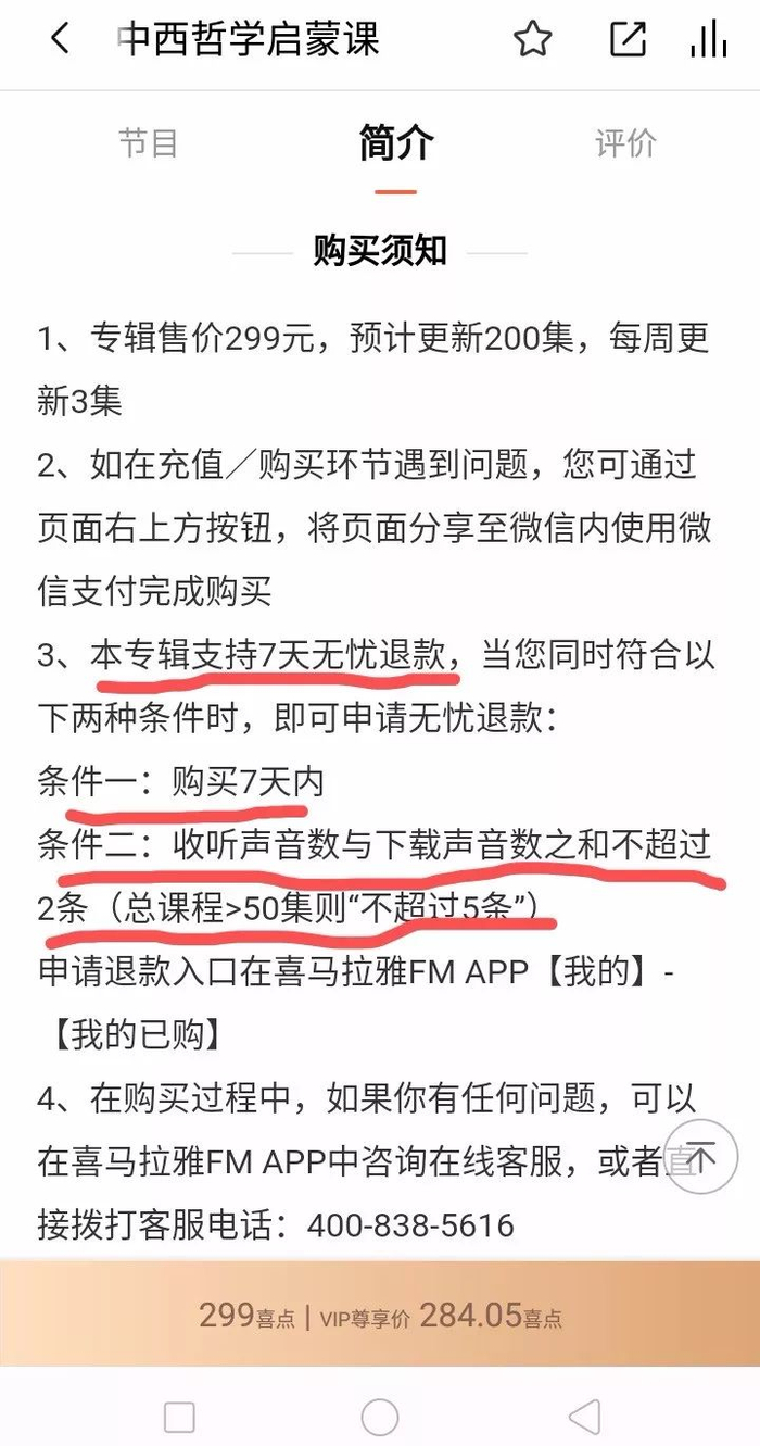 不过,无论是在安卓版还是苹果版的喜马拉雅FM的简介页面上,关于退款都未明确说明是退还“喜点”,购买须知中显示:支持7天无忧退款,且条件二为:7天内,收听和下载音频不超过2条,总课程50集则不超过5条。