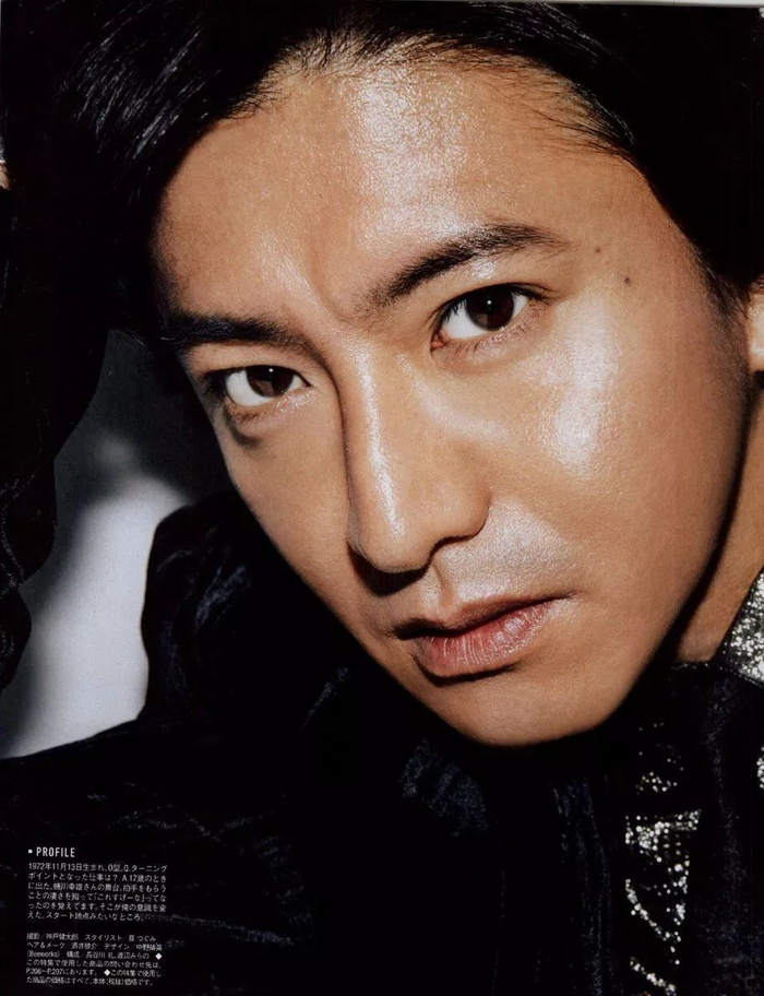 仔细看木村的脸,他既男人又男孩,他留长发不娘只是发亮,他骨感分明适合所有时代造型,童叟无欺他就是偶像的定义,也因此,三十年过去,当他不再是玫瑰般少年,他依然可以在天南地北激发大家说:欧,我爱你被摧残了的脸。