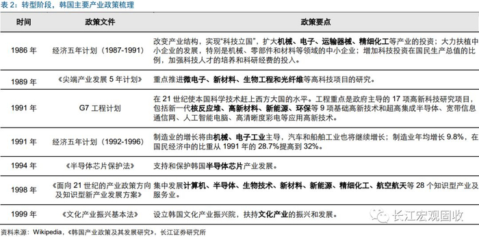 1)日本和韩国具备相似的转型起点,政策引导产业结构升级、顺利实现增速换挡。日、韩转型阶段,政策引导战略性新兴产业快速发展,经济增长转向技术与创新驱动。日本转型期间,大力扶持计算机、精密机械、航空等知识密集型产业;韩国转型期间,重点发展电子、精细化工、生物技术等战略性新兴产业。