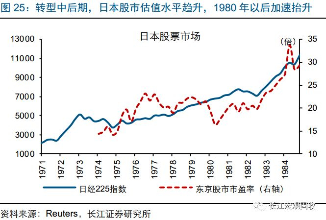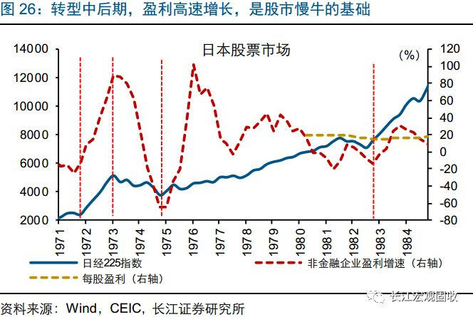日本转型中后期,盈利改善是股市慢牛的基础,估值抬升是主要推力;1980年代,低利率环境对估值的抬升起到一定作用。1971-1974年,日本转型前期经济增长大幅波动,股市与经济走势表现较为一致、波动较大。1975-1984年转型中后期,日本经济增速顺利换挡、实现中高速稳步增长,盈利维持较快增长,是日本十年慢牛的重要基础。即使在第二次石油危机期间,日本股市也并未受到明显影响。从估值视角来看,转型中后期,市盈率趋势性抬升,是股市慢牛的重要推力。市盈率的抬升,与经济预期好转、低利率环境均有一定关系,而低利率环境对估值抬升的帮助在1980年代表现得较为显著。