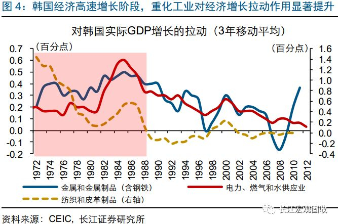 以重化工业为主导的快速工业化,是日、韩经济一度保持高速增长的重要方式。日本和韩国的产业政策和配套措施,对产业结构的变化起到重要作用。1950年代到1970年代初期,日本促进钢铁、电力、造船基础部门生产效率提升的同时,大力发展生产附加值较高的汽车、合成纤维、石油冶炼、石油化学和纸浆等重化工业,制造业以年均近15%的速度扩张。1960年代,韩国以轻工业等劳动驱动型产业为主导产业;追赶阶段中后期,经济转向资本驱动型,1970年代以钢铁、石化等重化工业为主,1980年代以造船、汽车等机械类重工业为主。