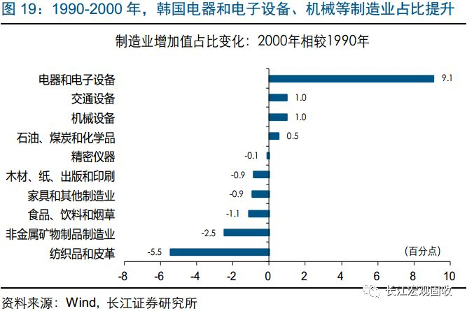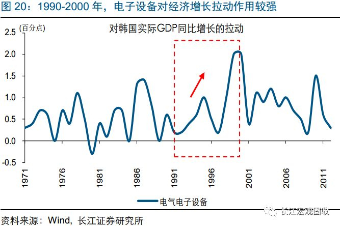 韩国转型期间,主导产业顺利升级为电子设备制造等高端制造行业,并对经济增长形成较强支持。转型期间,韩国支持科技发展的政策密集出台,重点支持计算机、半导体、生物技术等技术和知识密集型的战略性新兴产业发展。1999年,韩国发布《长期科技发展规划——2025年构想》,提出以“科技导向”引领国家经济、产业发展模式,更加重视科学技术进步对产业转型的支持作用。政策引导下,转型阶段,韩国主导产业顺利升级为电子设备制造等高端制造行业,并对经济增长形成较强支持。其中,半导体、数据处理设备、消费电子等韩国重点引导和培育的产业,在全球市场均具较显著领先优势。