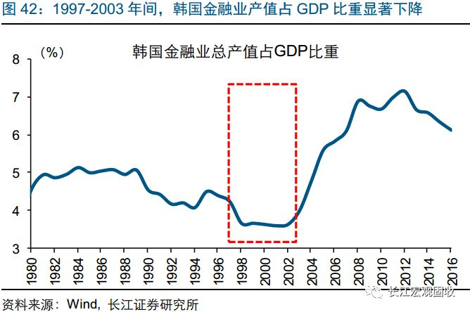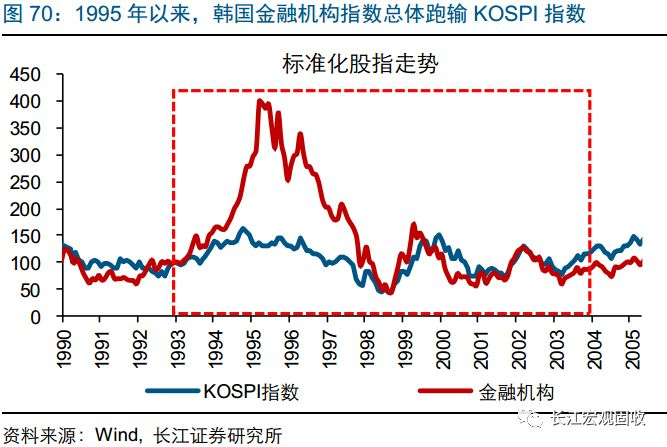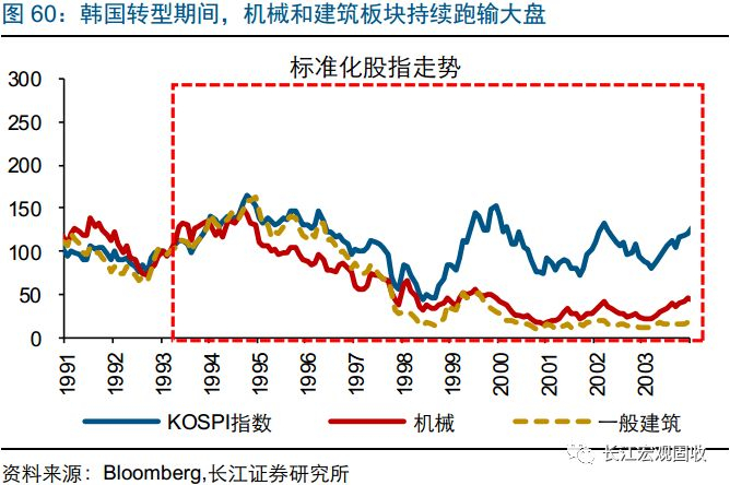 3)日、韩股市表现迥异,与转型期宏观经济环境和政策选择有关。日本转型中后期,财政政策不再盲目刺激、货币政策以通货膨胀为中介目标,叠加内外部环境相对稳定,使得产业结构升级对经济和预期的支持,向股市传导得较为顺畅。韩国转型前期,过度加杠杆刺激经济;转型后期,先后经历亚洲金融危机冲击、国内全面体制改革去杠杆,阶段性压制经济和风险偏好。2003年转型成功之后,韩国股市进入“长牛”。