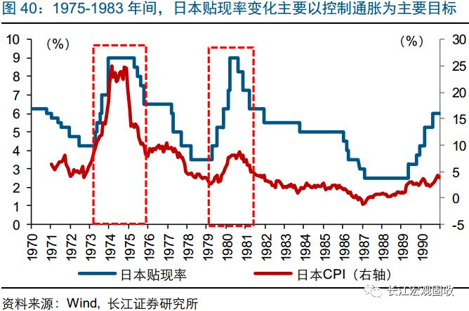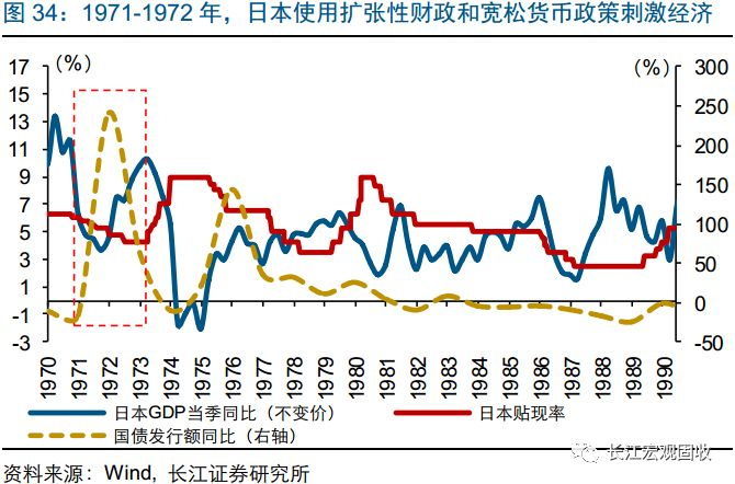 1970年代初期,日本并未认识到经济增速换挡的客观规律,而是使用刺激性财政和货币政策,导致经济和股市大起大落。1970年初,内部转型压力和外部“尼克松冲击”下,日元大幅升值、经济明显下滑。然而,日本政府并未认识到经济增速换挡的客观规律,而是以扩张财政 、宽松货币 来对冲日元升值对经济的影响。1973年,日本政府一度将GDP增速目标设为9.3%。然而,财政和货币政策双双扩张导致严重的通货膨胀,恰逢第一次石油危机的爆发,通胀进一步加剧,日本不得不收紧货币政策 ,导致经济和股市大起大落。